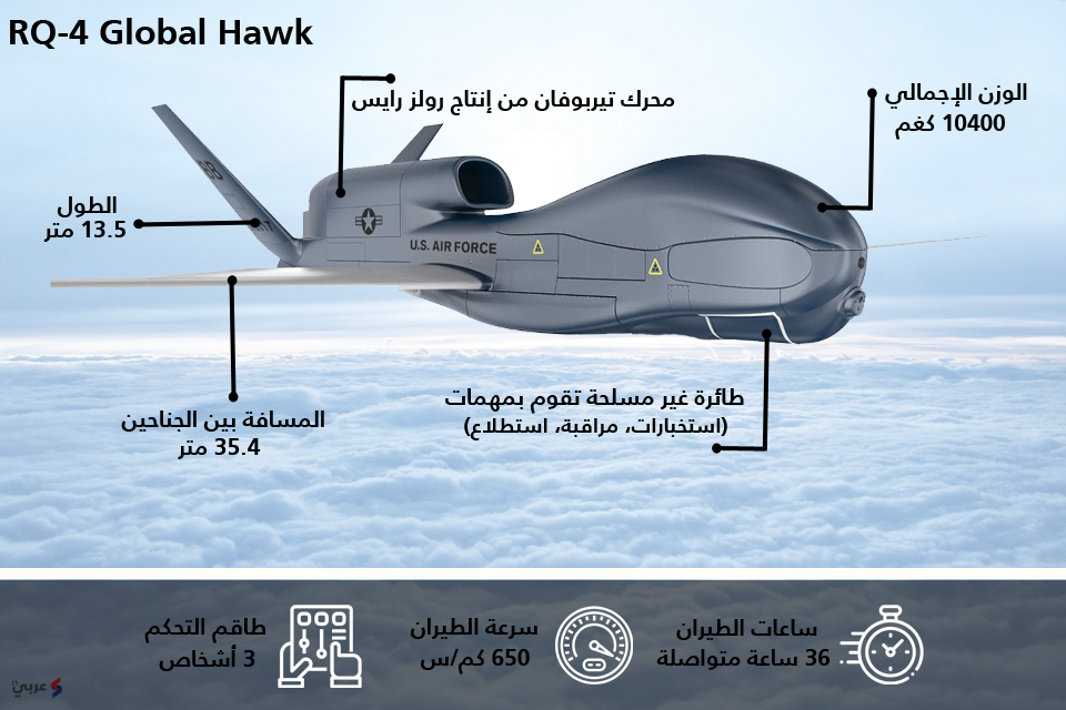 أسقطت الدفاعات الجوية الإيرانية "رعد" بصاروخ محلي من طراز "صياد" طائرة أمريكية مسيرة من طراز "آر كيو غلوباك هوك" يصل ثمنها إلى 130 مليون دولار.
