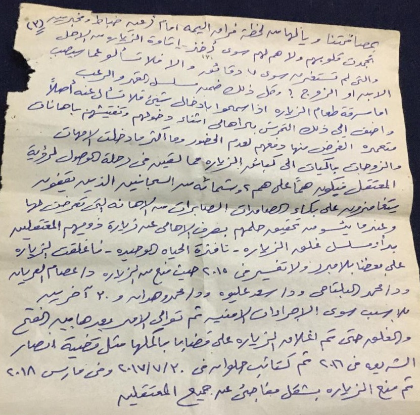 كبائن الزيارة ويهين المعتقل أمام أهله لكي يطلب المعتقلون من ذويهم عدم المجيء