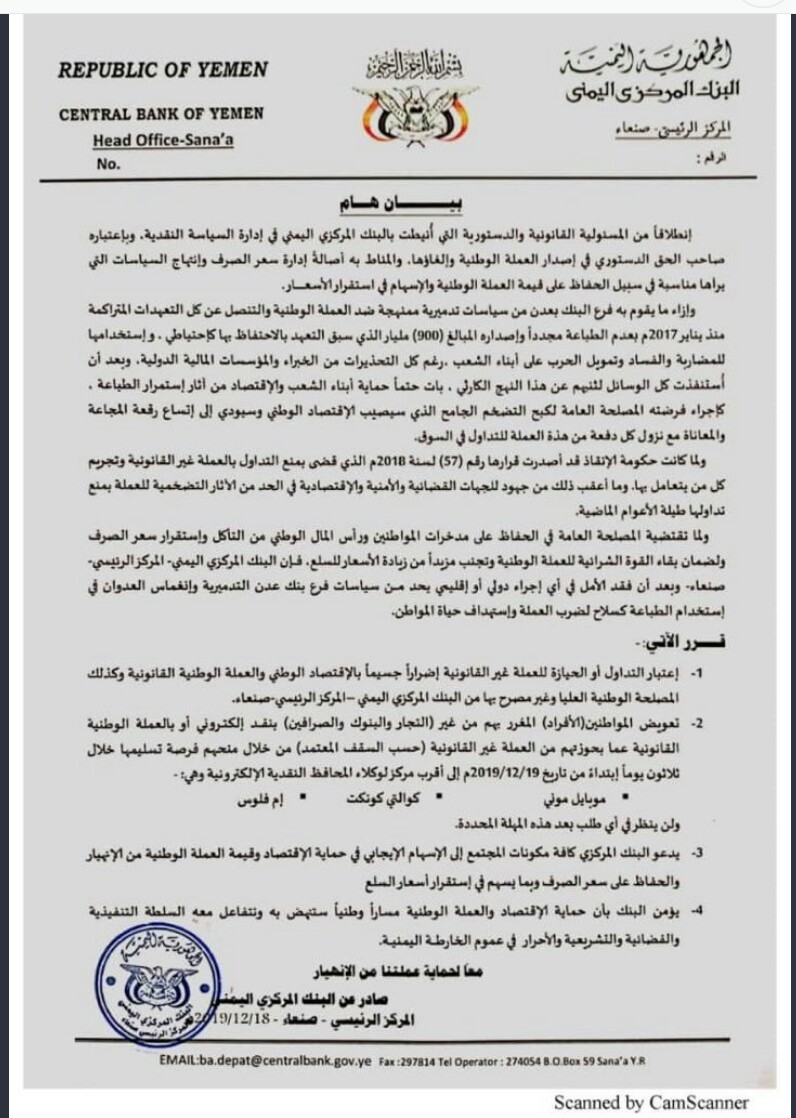 الثلاثاء، أصدر البنك المركزي في صنعاء الذي يسيطر عليه الحوثيون، قرارا بمنع تداول