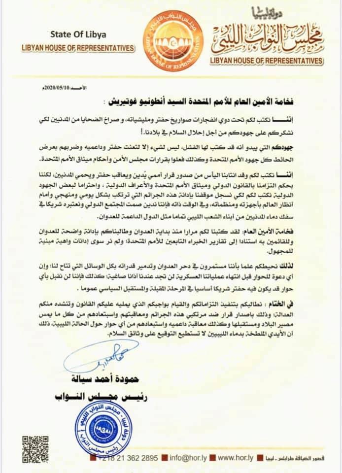 بدوره، قال مجلس النواب الليبي في طرابلس، إن جهود الأمم المتحدة كتب لها في الفشل في ليبيا، بسبب تعنت حفتر، وعدم معاقبته على ما يرتكبه من جرائم.