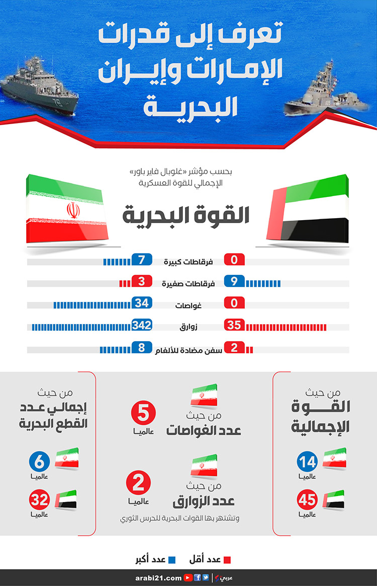 وفتح التوتر البحري بين البلدين المجاورين، العديد من الأسئلة حول القدرات البحرية لدولة الإمارات وكذا الجمهورية الإسلامية الإيرانية.