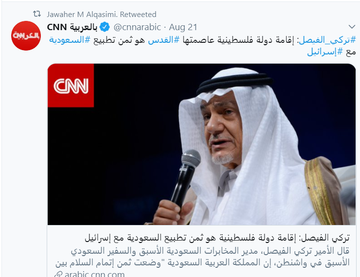 إذ قامت الشيخة جواهر القاسمي، زوجة حاكم الشارقة، بإعادة نشر خبر من "سي إن إن" بعنوان "تركي الفيصل: إقامة دولة فلسطينية عاصمتها القدس هو ثمن تطبيع السعودية مع إسرائيل".