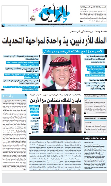 كما أبرزت الصحيفة على صدر صفحتها الأولى خبر اتصال الرئيس الأمريكي جو بايدن بالملك عبد الله الثاني، وكتبت بخط عريض: بايدن للملك: نتضامن مع الأردن.