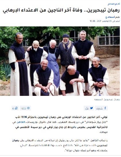 أُعلن دانيال نوريسات الكاهن في كاتدرائية القديس بطرس بالعاصمة المغربية الرباط أول أمس الأحد عن وفاة آخر الناجين من الاعتداء على رهبان تيبحيرين بالجزائر عام 1996 الأب "جان بيار شوماخر" في دير بمدينة تيفلت وسط المغرب.