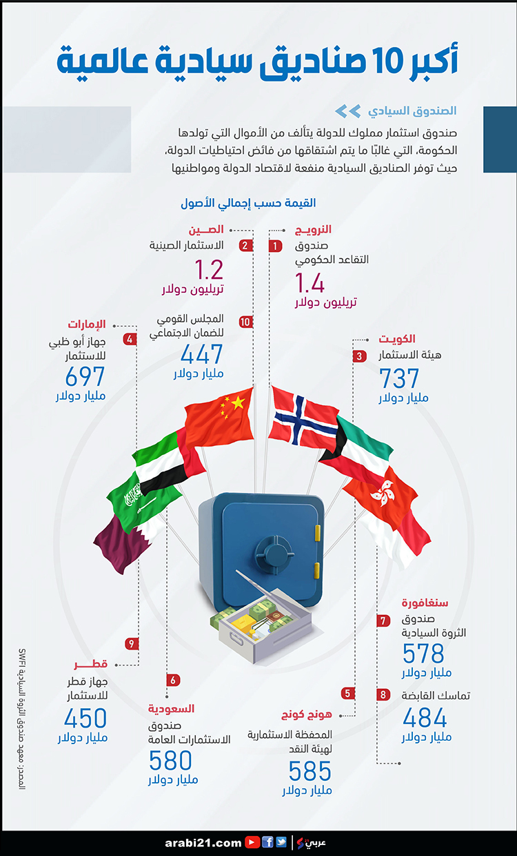 وفيما يلي إنفوغراف يستعرض أكبر 10 صناديق سيادية عالمية، بحسب إجمالي الأصول: