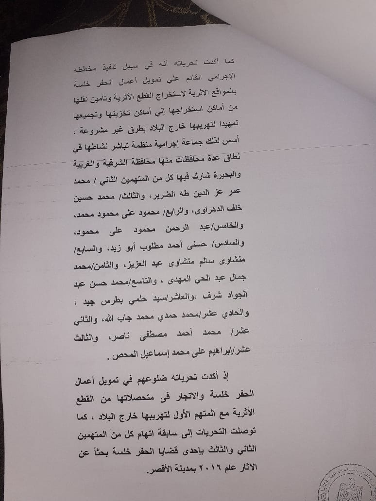 و"تباشر الجماعة الإجرامية المُنظّمة نشاطها في 3 محافظات مصرية، وهي الشرقية والغربية والبحيرة، وذلك بمشاركة 12 متهما آخر، تم ضبط عدد منهم وأقروا بارتكاب وقائع التنقيب عن الآثار خلسة وبطرق غير مشروعة، وأنهم مُموّلون من المتهم الرئيسي (أشرف الضرير)، وأنه يتم العمل لحسابه وتخزينها تمهيدا لقيام المتهم بتهريبها خارج الدولة المصرية لبيعها في الخارج بصالات المزادات المختلفة بمعونة زوجته الأمريكية"، وفق المستندات الحصرية التي حصلت عليها "عربي21".
