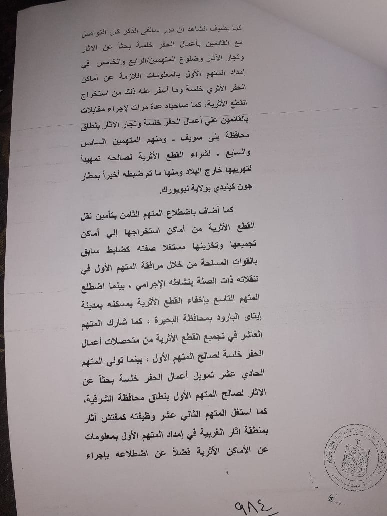 وأشار المحقق المصري إلى أنه تم تفتيش مسكن المتهم، وعُثر في حيازته على عدد من "الكتالوجات للقطع الأثرية" الخاصة بصالات المزادات المختلفة التي يتعامل معها المتهم، وكذلك أوراق تبين أنها مسودات لعقود خاصة ببيع وشراء قطع أثرية.